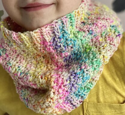 The pattern includes two sizes - adult and kids. The cowl is crocheted with double strands of yarn, using in total approximately 180-200 g of DK weight yarn (200-220 meters per 100 g) for the adult size or 90-100 g of sock/fingering weight yarn (400-425 meters per 100 g) for the kids size.
