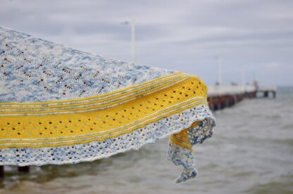 Seasons End is a crescent-shaped shawl bursting with lace, stripes and charisma.