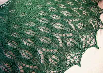 Seclusion is a wide crescent shawl, perfect for draping over your shoulders or wrapping as a scarf. The lace patterns flow seamlessly through the shawl and finish in a pointy dramatic border.