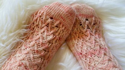 Worked in the round, Secret Garden contains both cuff-down and toe-up written directions and a chart for the pattern stitch. The pattern has instructions for an afterthought heel, but you may substitute whatever heel you enjoy using.