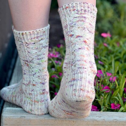 Enjoy the peaceful moment in a Secret Garden with this mellow knit that gently balances soft curves with distinct edges. The combination of dainty eyelets, twisted stitches and a textured lace pattern blend together to produce these delicately feminine socks.