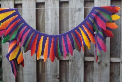 A curving scarf knitted in garter stitch with segments of colour. The segments of colour are created with short rows without wraps, easy!