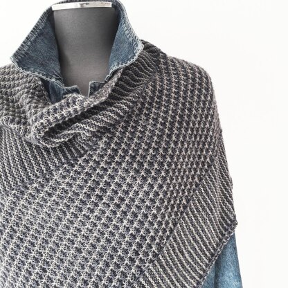 ekoï is a shawl worked laterally with stripes in garter stitch and a two-coloured textured stitch. The Latvian braid border gives a nice finished touch.