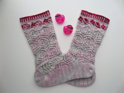 The pattern is written in one size due to the characters of the charts. The lace pattern is written out and charted. This sock knit per given gauge on given needles yields medium width women socks. The stretchy quality of lace makes it fit most leg widths, however you could adjust the pattern to fit a wider or narrower foot by going up/down a needle size. Foot and leg length are adjustable to fit.