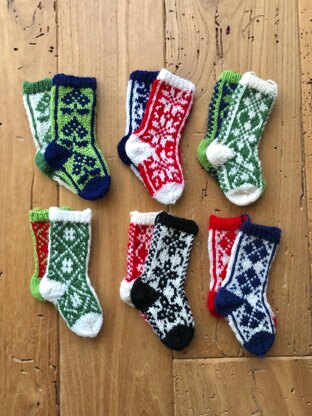 Adorn your Christmas tree with these cute mini Christmas stockings! There are six designs to choose from and you can make them in whatever colours you like, which makes them a great stash buster. All of the designs come from the traditional patterns used in Selbu, Norway.