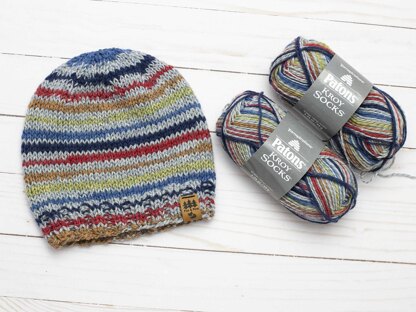 Our self-striping hat knitting pattern is perfect for making handmade gifts for your loved ones, young and old. The pattern uses two strands of yarn worked together. This popular Patons Kroy Sock Yarn has so many lovely colorways to choose from.