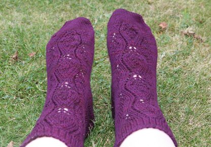 These socks get their name from the chart of the stitch pattern which resembles a snake’s head. The socks are worked toe-up. A gusset is worked before a short-row heel using the German short-row technique. Once the heel is completed and the gusset stitches decreased away, the Serpent’s Head pattern is added to the back as well as the front of the sock leg. The sock is finished with a classic ribbed cuff.