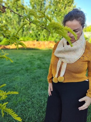 Worked from end to end in moss stitch then finished with extra large pompoms on each pointed end, this scarflette is a quick and easy make using just 150g of bulky weight yarn (plus some extra for your poms. I highly recommend using scraps for your poms, you can even use multiple colours for a fun speckled effect).