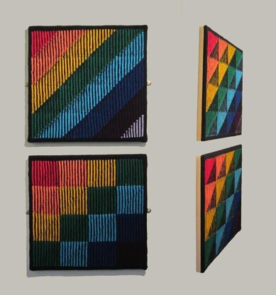 One photograph shows what appear to be two identical cushions/wall-hangings. Look at them from a different angle and you will see that one has squares and the other has diagonal stripes.