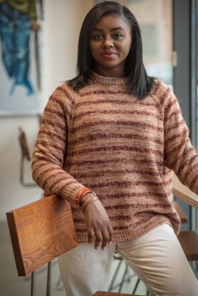 Shady Side is a sweater love song to indie dyed yarn. This chic, casual fitting striped pullover is knit with fingering weight yarn and features subtle stripes created by holding mohair lace double with the main yarn. Use your favorite indie dyed sock yarn, paired with decadent mohair silk lace.