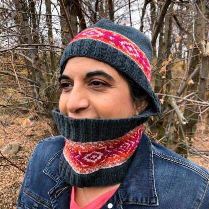 A Sharav is a hot, dry eastern wind. It brings dust and sand, blowing across the Mediterranean Sea to Europe, North Africa, and the Middle East. This hooded cowl, or balaclava, knit in one piece, mostly in the round, from the bottom up will protect you from any wind, not just the hot ones. With the cowl up on your face, it can even shield you from blowing dust or ice particles. The stranded color work evokes the geometric art of the Middle East and just might give you better visibility in a storm.