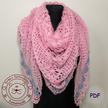 With yarn length 225/25 this shawl is about 165x165x250 cm big.