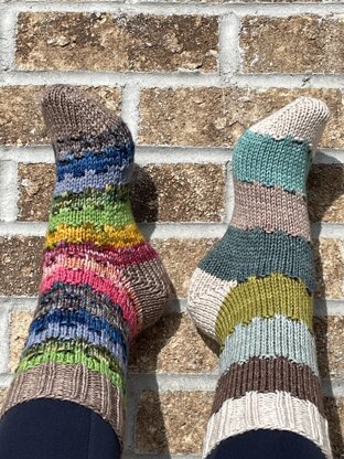 This sock is knit top down with a shadow wrap heel and a wedge toe. You can substitute another heel and toe if you would like, but the MC yarn amounts may change. It is written for magic loop, with N1 being the front of the leg/foot/toe and N2 being the back of the leg/heels/foot/toe. At the color changes their are some special rounds to make this sock a lot of fun to knit. It is great for mini skeins or leftover DK sock yarn.