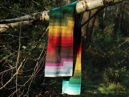 A garter stitch wrap with mitred stripes designed to showcase colour transitions, with options for 4 Ply or DK mini-skeins.