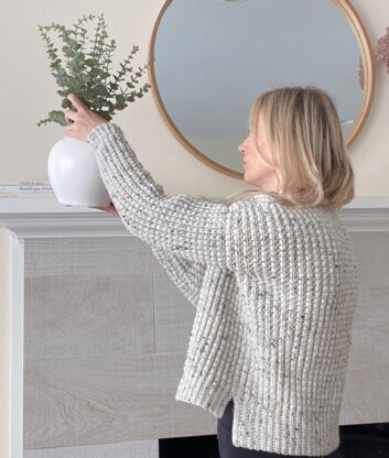 The back panel features a slightly longer length and side-split hem ribbing for added visual interest. The sweater is worked in separate pieces and seamed together.