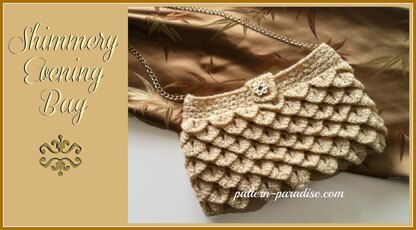 Perfect for those upcoming holiday parties, a beautiful and elegant evening bag. The shimmer of the yarn makes this a very special accessory. For an added touch of glamour, attach a pearl or bead to the center of the crocodile stitches. You can make it with or without the shoulder chain.