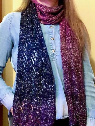 A basic repeat pattern with sophisticated results. Lacey diamonds with a touch of shine. Using variegated yarn gives striking results! Knit as long as you’d like, or bind ends for a fun infinity scarf.