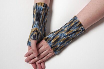 These unisex fingerless mittens are worked entirely in slip stitches. The smooth main pattern goes well with variegated yarn, the thumb part adds some interest in texture.