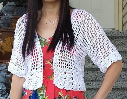 Looking for a crochet mesh cardigan that is just the right length for summer dresses? This cardigan has it all. Very versatile to wear, for day or night, this cardigan looks great with sun dress, even party dress. Designed using the popular mesh crochet stitch allover, accented with pretty shell edging for that feminine touch. Easy enough to make, with no shaping required, yet this cardigan gives a shapely look that flatters.