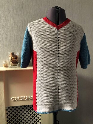 This pattern features a V neck, short sleeve t-shirt, designed with panels either side and joined across the centre, front and back. Basically the shirt is join-as-you-go, with only minimal sewing together. The t-shirt is made using Paintbox DK cotton as this is perfect for clothing.