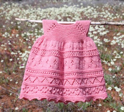 Sierra Rey is sure to become an heirloom piece to be handed down from baby to baby. Top down construction, with a princess skirt and a rich lace hem. You only will have 2 ends to weave in when you are done. This is designed with positive ease, so there will be lots of room to grow into a tunic.