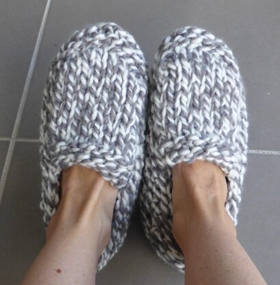 These chunky knit Slippers are quick to knit and will keep your toes warm and toasty. Worked in easy garter stitch and stocking stitch, the pattern includes six sizes, so you can knit a pair for everyone in the family!