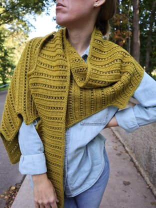 This asymmetrical crochet wrap features a triangular shape, unique sawtooth edge, and subtle openwork detailing with an easy faux i-cord border for a perfectly clean finish. It’s a striking yet wearable piece that drapes effortlessly over your shoulders. It can be worn as a shawl, wrap, or scarf — perfect for cold-weather layering.