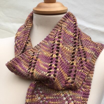 This is a shortie, cravat style scarf with an eyelet pattern that moves diagonally across the fabric. It looks a lot more complicated written down than it is to make! Once the first eyelets are set in place you will soon get the method of moving them across by one stitch on each right side row.