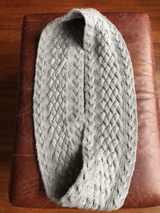 The Silver Plaited Infinity Scarf employs reversible cables for a thick, squishy, comfy scarf that is beautiful no matter how it lies. It is 5.75” wide by 53” long and knit in a pima cotton/acrylic blend with some shine to it. Being knit with cotton, it is perfectly soft for those with more sensitive skin, or for days that aren’t so cold, when you wish for the comfort of a soft scarf to wrap around you. It was inspired by a piece of silver Celtic jewelry and my love for braids.