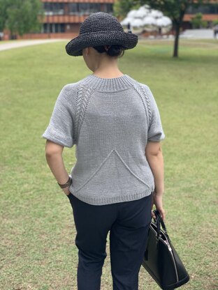 silver sweater is a short sleeve sweater with little cables. I added some crossed stitches for the back body(you can wear it front and back). Worked from top-down, in the round. You can adjust the length as you like. I love this simple style with little accents.
