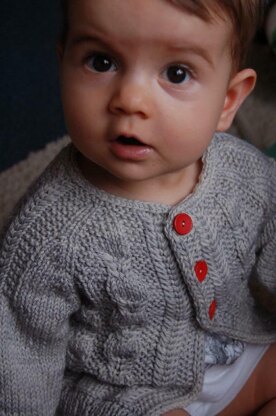 This cardigan is worked from the bottom up and features an easy cable pattern on a garter stitch background. Sleeves are worked in the round first, and body is worked flat. Sleeves are then joined to the body to work the yoke in one piece. The neckline is finished with an I-cord bind-off. Both charts and written instructions are provided.. **Skills**: cast on, knitting, purling, increasing, decreasing, knitting in the round, following a simple cable pattern (charts and written instructions provided), I-cord edging (explanations provided), yarn over, I-cord bind off (explanations provided), a small amount of grafting (link to online kitchener stitch tutorial provided). **Gauge**: 20 sts x 30 rows in stockinette st using lg ndl