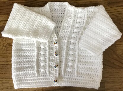 This is a crochet pattern for a v-neck cardigan for a baby or child. The simple pattern makes it ideal for either a boy or a girl. The bobble pattern panel is based on trebles and gives the cardigan some texture without being too fancy.
