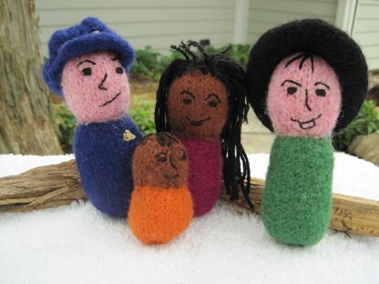 These simple dolls, first knitted in the round on size US 8 double-pointed needles, then felted in your washing machine, are perfect for babies or toddlers, as there are no extra pieces or parts if you don't want them! You choose skin color, outfit color and facial features. The pattern includes instructions for all three sizes, plus the dog and cat. There are so many possibilities! Also included are suggestions for attaching hair and simple embroidery stitches. Felt them lightly for a bigger doll with a bigger head or leave them in the washer longer for a tighter felt (and a little smaller) doll. Leave the dolls unstuffed for great little finger puppets! Knit up a whole city in an afternoon!