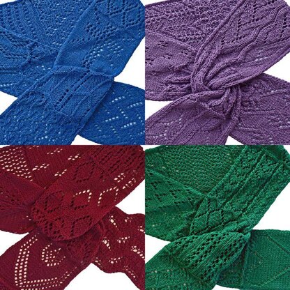 All of the laces have been adapted for simple knitting. They require just 4 shaping stitches: YO, K2tog, SSK or SKPO and S2KP2 (double decrease). The placement of these stitches create all of the samples in this series.