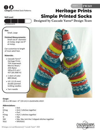 Simple Printed Socks in Cascade Yarns Heritage Prints - FW269 - Downloadable PDF ist eine Kostenlos Anleitung zum Knitting von Cascade Yarns, die als Herunterladbares PDF in den folgenden Sprachen verfügbar ist: Englisch. Besonders geeignet ist sie für alle, deren Können bei Fortgeschritten einzustufen ist. Probiere sie noch heute aus und kreiere dein nächstes Meisterwerk!
