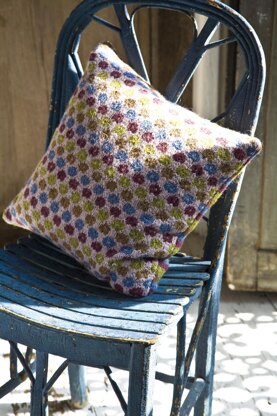 This square Fairisle cushion (from Martin’s Easy Fairisle Knits) has two different Fairisle motifs, worked in a bird’s-eye pattern with a central band of little fairisle circles, using three different colours of Rowan Felted Tweed. Easy to work as only two colours in a row.