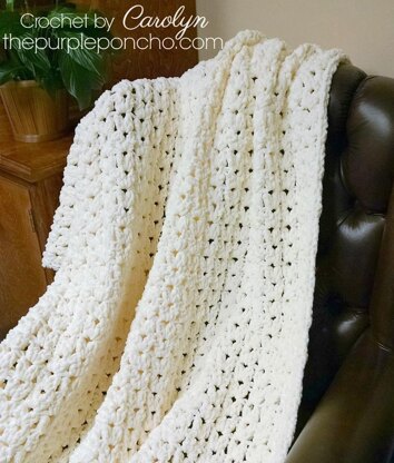 This blanket is very thick and soft and made with bulky yarn and a large hook. This works up easily, quickly, and will keep you warm and cozy. It’s easy to customize the size, but no matter what size you make, this is an easy pattern with high impact results!
