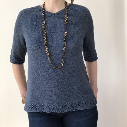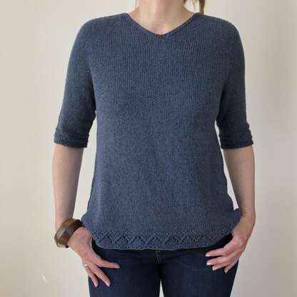Simply Denim is a casual V-neck tee. It is worked mostly in Stockinette Stitch, embellished with a little lace border at the hem and some texture stitches at the sleeves and neck band, giving it a clean look with some attractive details. The tee is worked top down in one piece, first in rows, then, after finishing the V-neck, completely in the round.