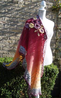 Sinnestriel is a rectangular shawl with sewn on crocheted flowers. The shawl is crocheted using many different interesting stitch patterns, such as two different spider stitch patterns.