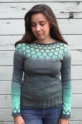 This mermaid inspired sweater combines fair-isle patterning with the magic of ombré yarn. The bright mint fish-scale pattern on the yoke and sleeves blends slowly into a deep grey-green body. The sweater is knit from the top down in one piece, so there are no seams to sew and you can try it on and adjust the fit as you go.
