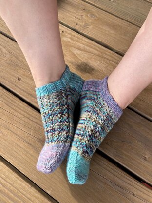 Yarn: Sweet Mountain Crafts Scree Sock, 80% Superwash Merino/20% Nylon, 389 yards/100g. Sample knit Two Sisters and Some Yarn set, which includes a full skein of the main color and two minis (purple and aqua) each 78 yards/20g. My medium, size 10 socks used 211 yards total; approximately 117 main color, and 46 of each of the others.