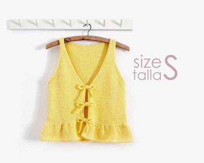 The SORBETTO TOP is a light, comfortable summer knit with a simple yet feminine style. Its open front with three delicate ties and soft flounce at the hem make it versatile for everyday wear or special occasions. Available in adult sizes (XS–XL) and girls’ sizes (2–10 years), it’s perfect for matching looks or as a thoughtful handmade gift