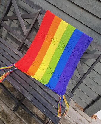 The Shawl has 6 stripes in happy, bright, pride colors, and you will also work a heart shaped lace pattern on each stripe.