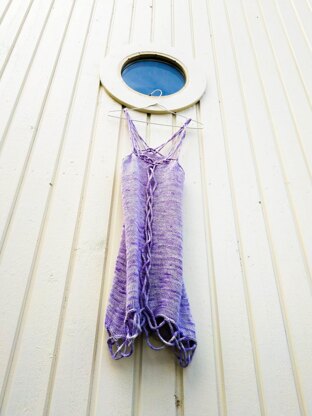 The dress is knitted seamlessly from the top down. Starting with the straps made from 3 i-cords that are braided. The braids are continuous and run through the whole dress ending at the hem. An i-cord bind off is used on the hem and arm holes to prevent curling, and the hem cables are attached to the i-cord bind off by knitting.