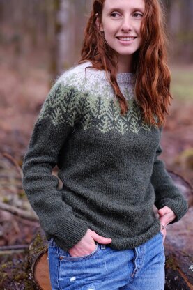Sleeves and body are worked in the round from the bottom up. They are joined together to work the yoke and neckline in the round. Some knitters may find that they need a different needle size to achieve gauge in stranded colorwork.