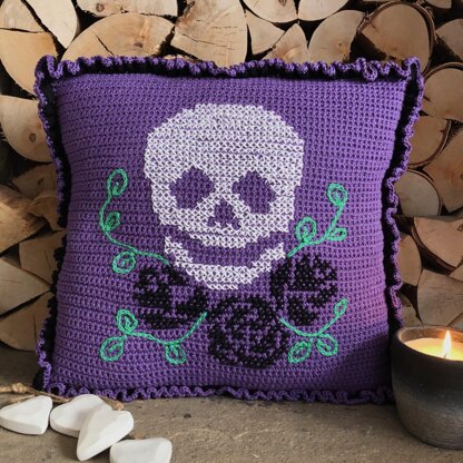 An eye-catching cushion made from double crochet and embroidered with a cross stitched skull with rose flowers design. The rose stems and leaves are created with surface slip stitches. The cushion is finished off with a treble stitch ruffled edging and simple crocheted buttons to join the back opening.