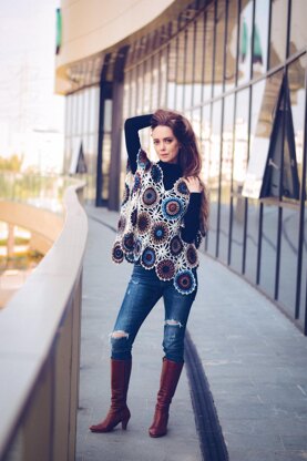 This poncho/top is a rectangle composed of big circle motifs and small flower motifs joined together as you work the last round. Small motifs are inserted in between the big motifs attaching to their vertices and to joinings between big motifs. To leave a hole for the neck opening, you leave several motifs unattached and reduce work one small partial motif at the center front.