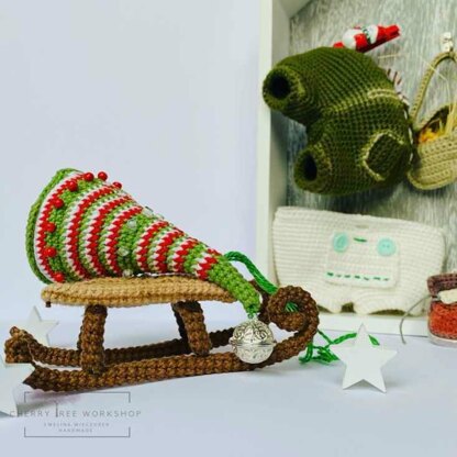 Pattern for carrying the sleigh with a christmas tree out with crochet method. Pattern in the form of PDF file. According to the pattern the mascot is made with YarnArt Jeans