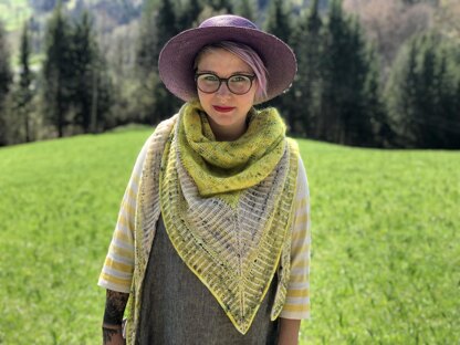 Das Dreieckstuch wird in breitem Rippenmuster, ein- und zweifarbigem Patent und verkürzten Reihen gearbeitet. Dabei werden unterschiedliche Garnstärken kombiniert. So entsteht ein fluffiges Tuch, dass im Nu gestrickt ist - und dabei nicht langweilig wird!