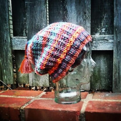 Slippy Slouch was created to show off beautiful hand spun and hand dyed Aran weight yarns using slipped stitches and mistake ribbing to create texture without fussy designs that might distract from the beauty of the yarn. This is a big hat because I look silly in little hats.